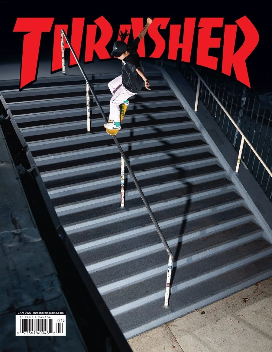 First Thrasher Cover of 2023! Funa Nakayama with a heavy FS Crooked Grind down Hollywood Hills High 16 for January 2023’s Cover!